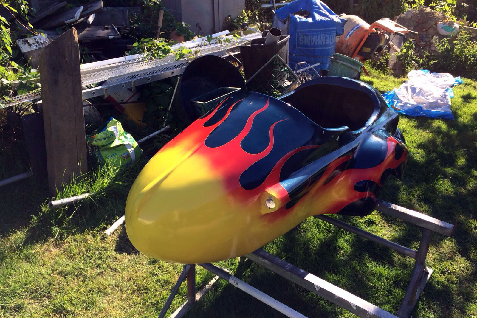 In June 2019 we were contacted by Nick Cowley who told us he had purchased the sidecar on ebay in 2015, and had it shipped from Jersey to his home in the Isle of Wight. It came with a 1970’s flames paint job.